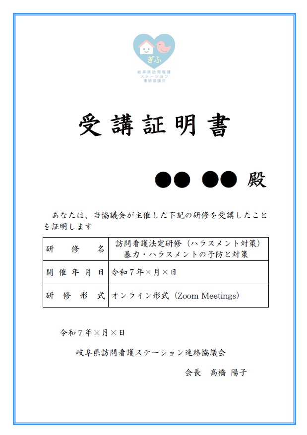 「訪問看護法定研修(ハラスメント対策)」受講証明書の送付案内