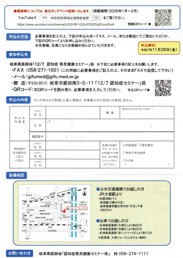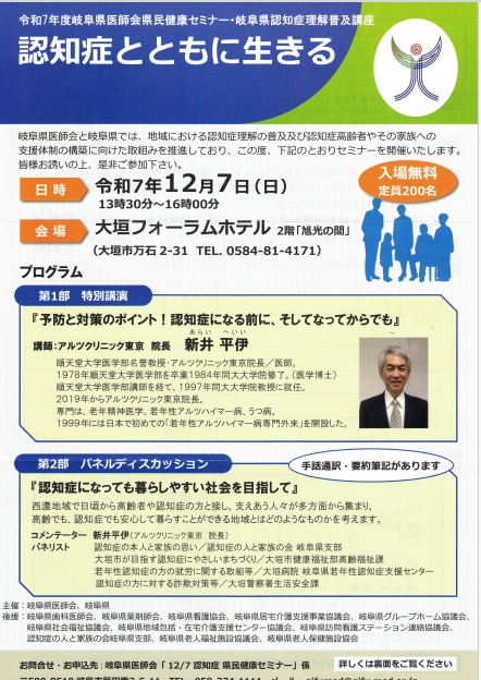 2025.10.27 その他 「認知症とともに生きる」(令和7年度岐阜県医師会県民健康セミナー・岐阜県認知症理解普及講座)開催案内 岐阜県医師会と岐阜県では、地域における認知症理解の普及及び認知症高齢者やその家族への支援体制の構築に向けた取り組みを推進しており、この度、件名のセミナーを開催します。