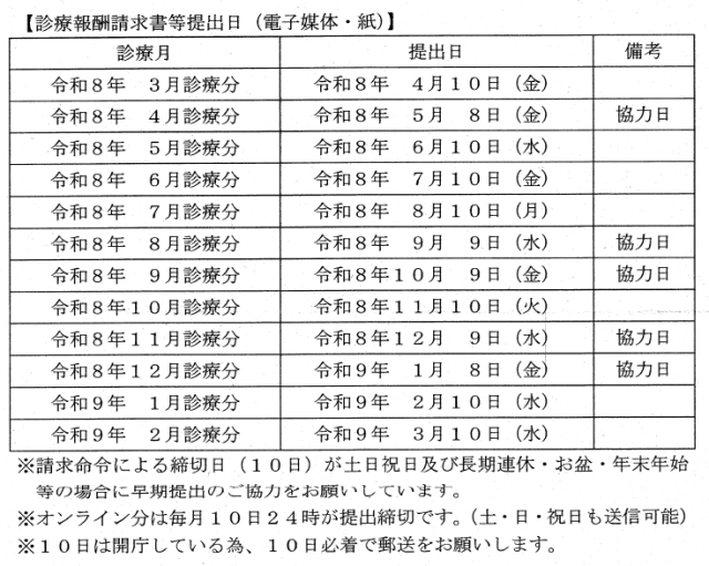 2026.02.02 国・県の情報 令和8年度診療報酬請求書等の提出日について 岐阜県国民健康保険団体連合会より、令和8年度の診療報酬請求書等の提出日を下記のとおり予定する旨の連絡があり、ご協力願いたいとの依頼がありましたのでお知らせします。