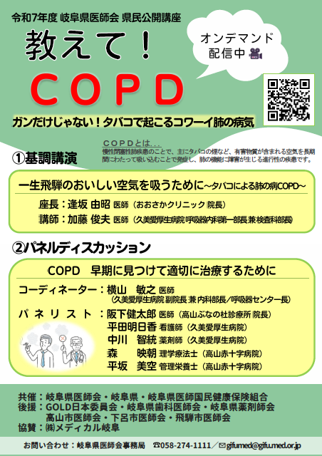 岐阜県医師会より、令和8年3月20日(金・祝)に開催されたセミナー「教えて!COPD~ガンだけじゃない!タバコで起こるコワーイ肺の病気~」のオンデマンド配信を開始したとのお知らせがありましたのでご案内いたします。