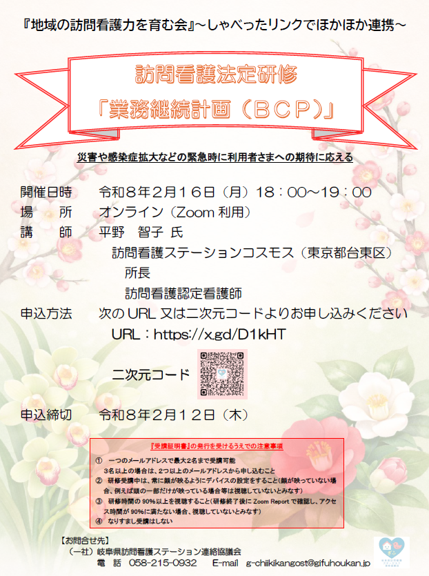 訪問看護法定研修「業務継続計画(BCP)」開催案内 |研修会・講演会|岐阜県訪問看護ステーション連絡協議会 訪問看護法定研修「業務継続計画(BCP)」開催案内 |研修会・講演会|岐阜県訪問看護ステーション連絡協議会